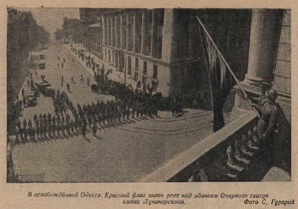 Одесса! Мы не верили своим глазам. Мы смотрели жадно, до боли в глазах, и, вероятно, от напряжения и сильного ветра глаза у нас были мокрые. Ведь ещё утром мы видели белый снег под Москвой, и вот под нами Чёрное море, гавань, узкие выступы пристаней, уцелевшее здание элеватора и дальше пленительная геометрия одесских улиц и площадей, бульваров, приморских кварталов, увенчанных великолепной громадой Оперного театра.