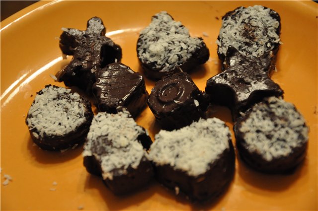 в горячее молоко(~75 гр) добавить ложку желатина,какао-порошок(75 гр),мед(по вкусу),сливочное масло(гр 20),ваниль.Немного прокипятить до равномерной массы,разлить по формочкам и в холодильник.