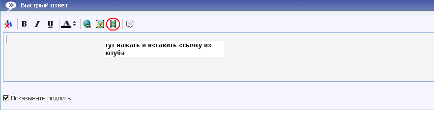 среди иконок выбираешь изображение киноленты, жмешь - появляется "вставить видео" - и вставляешь в адресную строку скопированный адрес