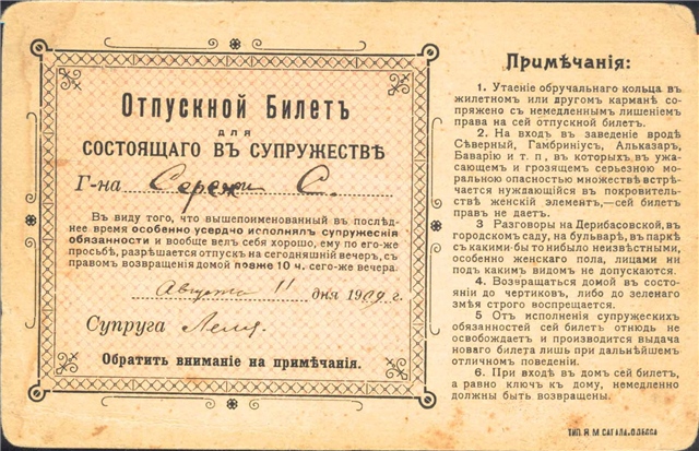 На обороте открытки некий одесский жених образца 1909 года Сергей С. игриво пишет своей будущей жене Леле: "Посылаю тебе пробный экземпляр отпускных билетов для твоего будущего супруга. Когда поженимся, получишь сотню таких. Хорошо? Твой Сержик".