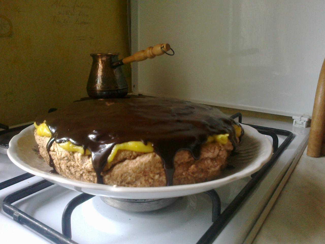 На выпеченный (уже остывший), воздушный корж кладем густо крем, сверху заливаем глазурью.