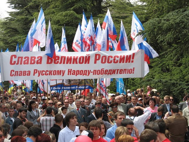 мне вот интересно.. "Русское единство" празднует ВСЕГДА выступает на всех своих собраниях ТОЛЬКО под российскими флагами..символика ссср, россии присутствует всегда и во всем.. украинской символики, атрибутики практически нет вообще.. и все это происходит на территории Украины. самостоятельной страны, со своей собственной конституцией...