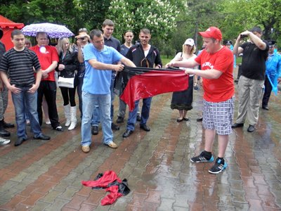 Не дождавшись националистов, комсомольцы попытались сжечь красно-черный флаг, но намокшая под дождем ткань так и не загорелась.