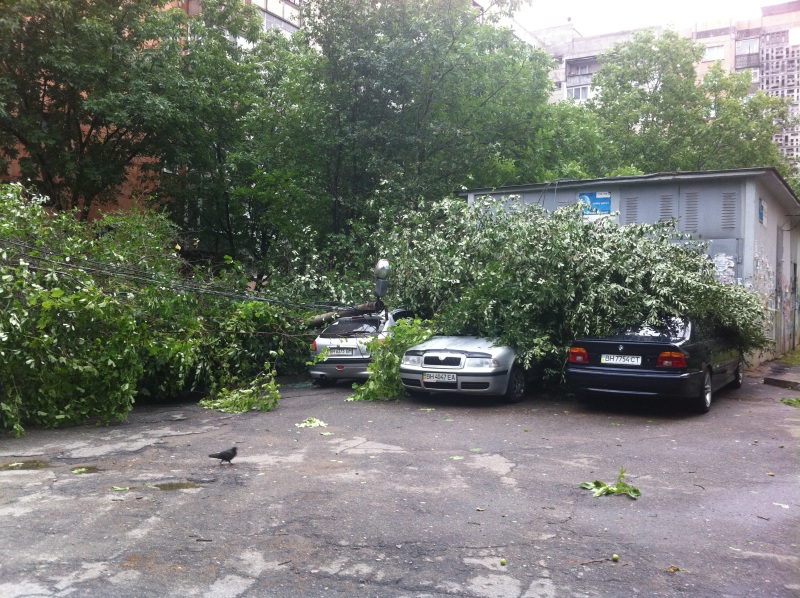 Пострадала только левая машина,владельцы ещё 3 авто весело смеялись. А вот левому досталось по полной:на задницу столб упал,на передницу-дерево