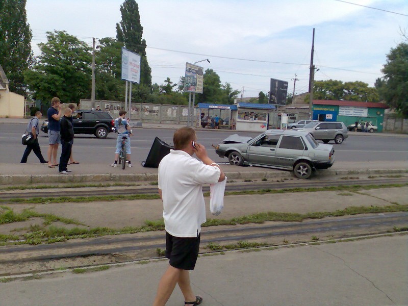 я вчера стоял на ярморочной в крайнем левом, ждал свой зелёный в сторону города... вдруг слышу протяжный свист скользящей по асфальту резины... мои руки и ноги всё сделали сами, а увиденное глазами в зеркало заднего вида дало понять, что можно оставаться на месте)))) после того как это ведро эффектно ввалилось на бордюр и остановилось об второй столбик я выключил первую и оставаясь на месте наслаждался как это дебил вылез из салона и скакал с трубкой у уха нарезая вокруг останков своего корыта круги... потом я убрал свою машину с проезжей части и сделал фотосессию)))