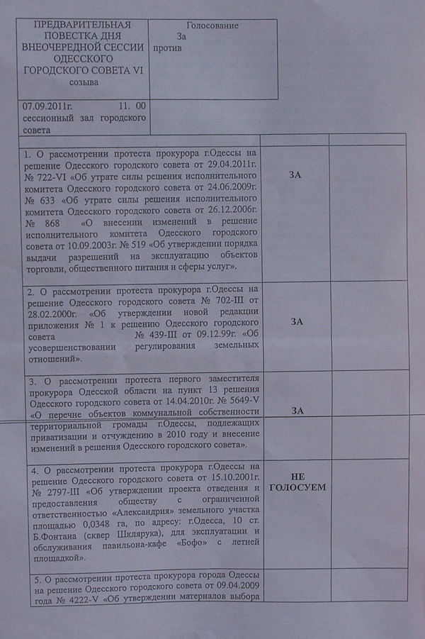 За все протесты прокурора, кроме пункта 4, депутаты должны были проголосовать «за», напротив 4 вопроса написано «не голосуем». Отметим, что касательно протеста прокурора о строительстве подстанции в парке Шевченко были сомнения до последнего.