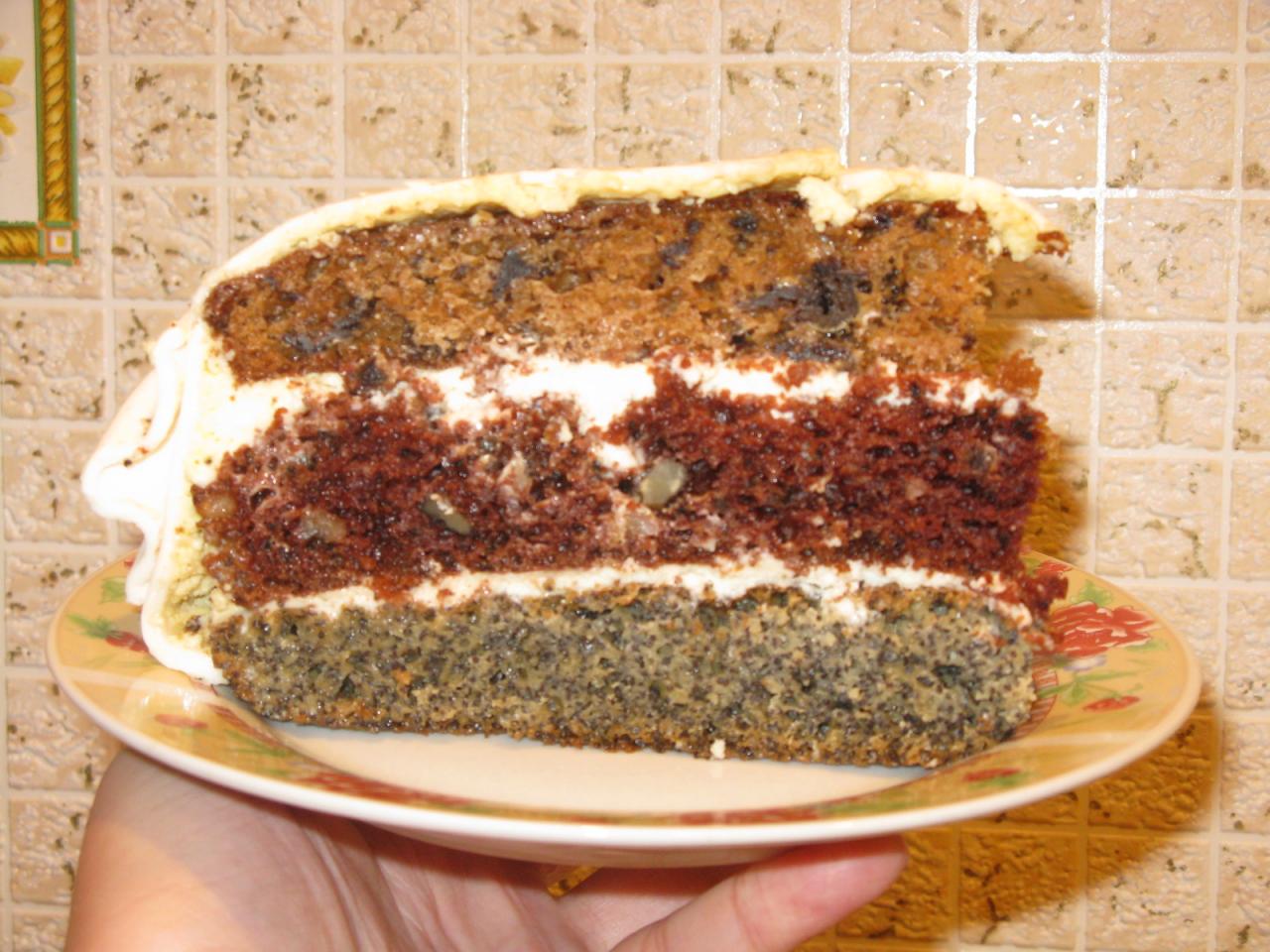 Теперь собираем торт,чередуя тёмные коржи(какао,мак) со светлыми(орехи,изюм).Так эстетичнее получается.