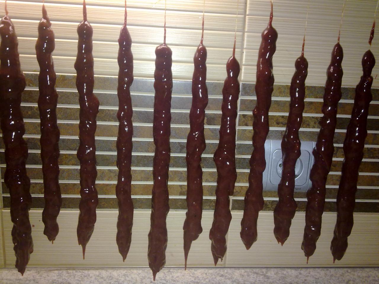 Оказалось, что только звучит страшно, и кажется, что мудреный рецепт, - на самом деле, нужно просто сделать очень густой кисель из виноградного сока и муки, и окунуть в него орехи (а если почитать инет, то сок может быть какой угодно, хоть и пачки, хоть апельсиновый) Главное, загустить.