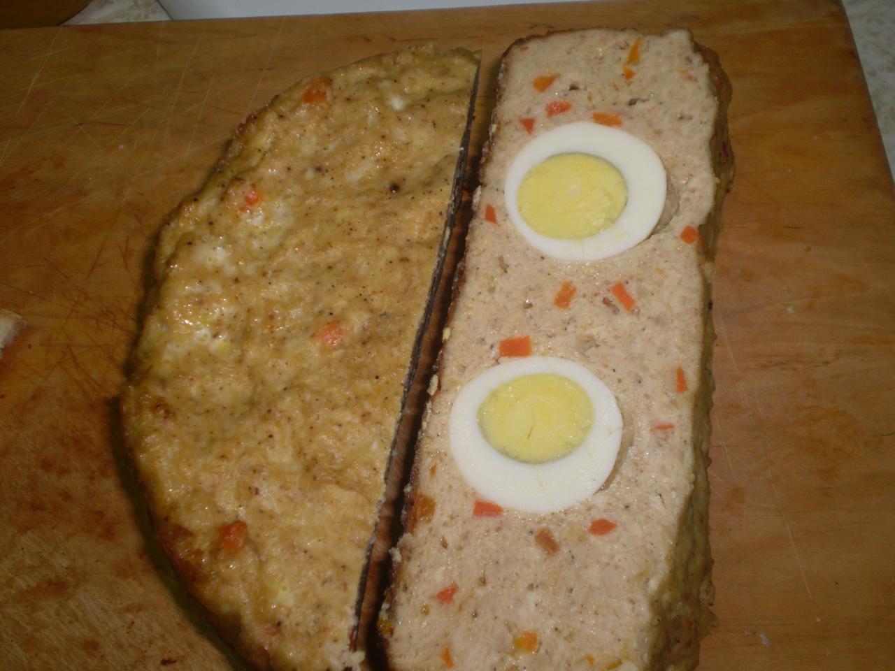 В кастрюлю уложила разрезанный рукав для запекания, выложила мясную массу, упрятала туда 4 варёных яйца)) пекла 2*50 минут, но это много - хватит 50+30.