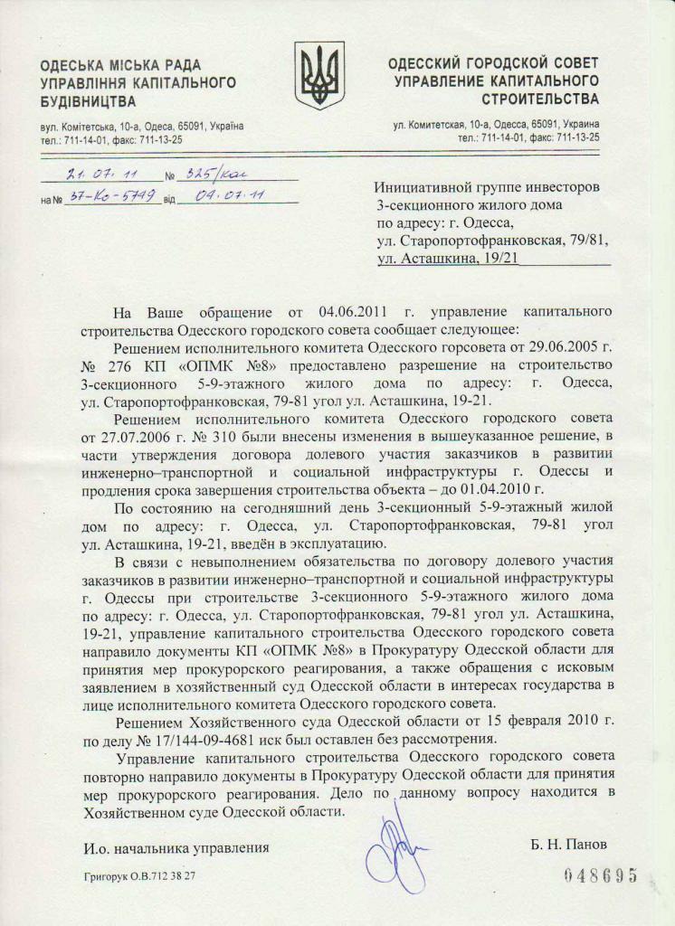 Я выставляла уже эти документы. Наш дом сдан по декларации. Это упрощенная (не окончательная) форма сдачи, без коммуникаций. Именно по этому городские службы - (Энегросбыт, Одесгаз, теплосети) и Гор. исполком не считают наш дом сданным.О чем они и пишут.