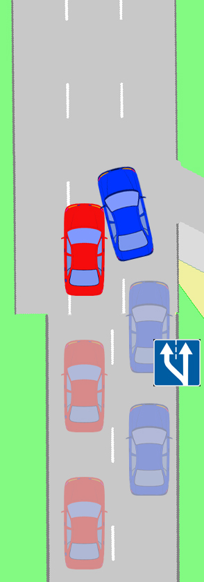 Ответ тут просто - виновен синий, так как знак не обязывал ни один автобиль менять полосу движения. Это не знак изменения конфигурации полос и их направления (ситуацию с перестроением по полосам из-за их смещения можно наблюдать возле светофора на повороте к трц Ривьера по направлению движения в сторону Южного. Там полосы для движения сначала смещаются вправо, а за перекрестком опять смещаются влево)