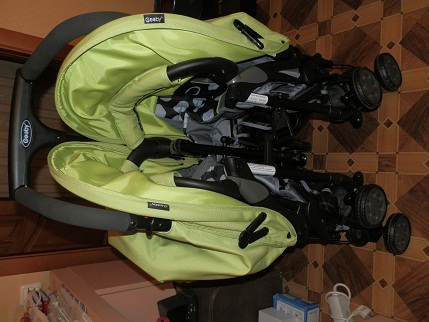Graco Phoenix - 14.600 - как раз тот вариант, когда передний ребенок не лежит горизонтально, ну колеса жесткие...Вообще она новорожденным не подойдет, только подросшим малышам.