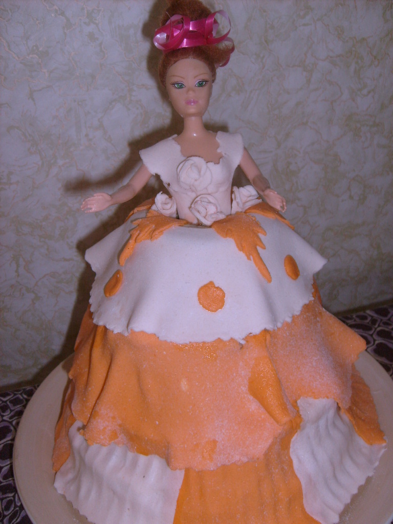 butterflay, я делала куклу так:торт Медовик. просто вырезала коржи разного диаметра, собирала как пирамидку от большего к меньшему.Раскатывала примерно, а потом уже вырезала нужный диаметр с дырочкой посредине чтоб вставить куклу потом.Дала тортику ночь пропитаться в холодильнике,затем вставила куклу,обмотанную пищевой пленкой до пояса.Вот что получилось