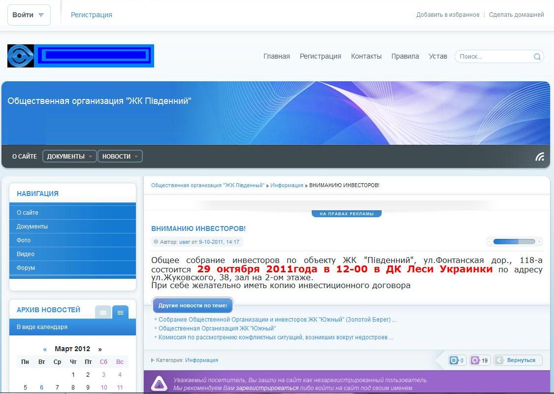 15 марта 2012 года (четверг) в 19.00 состоится Собрание Общественной Организации и инвесторов ЖК "Южный" (Золотой Берег).