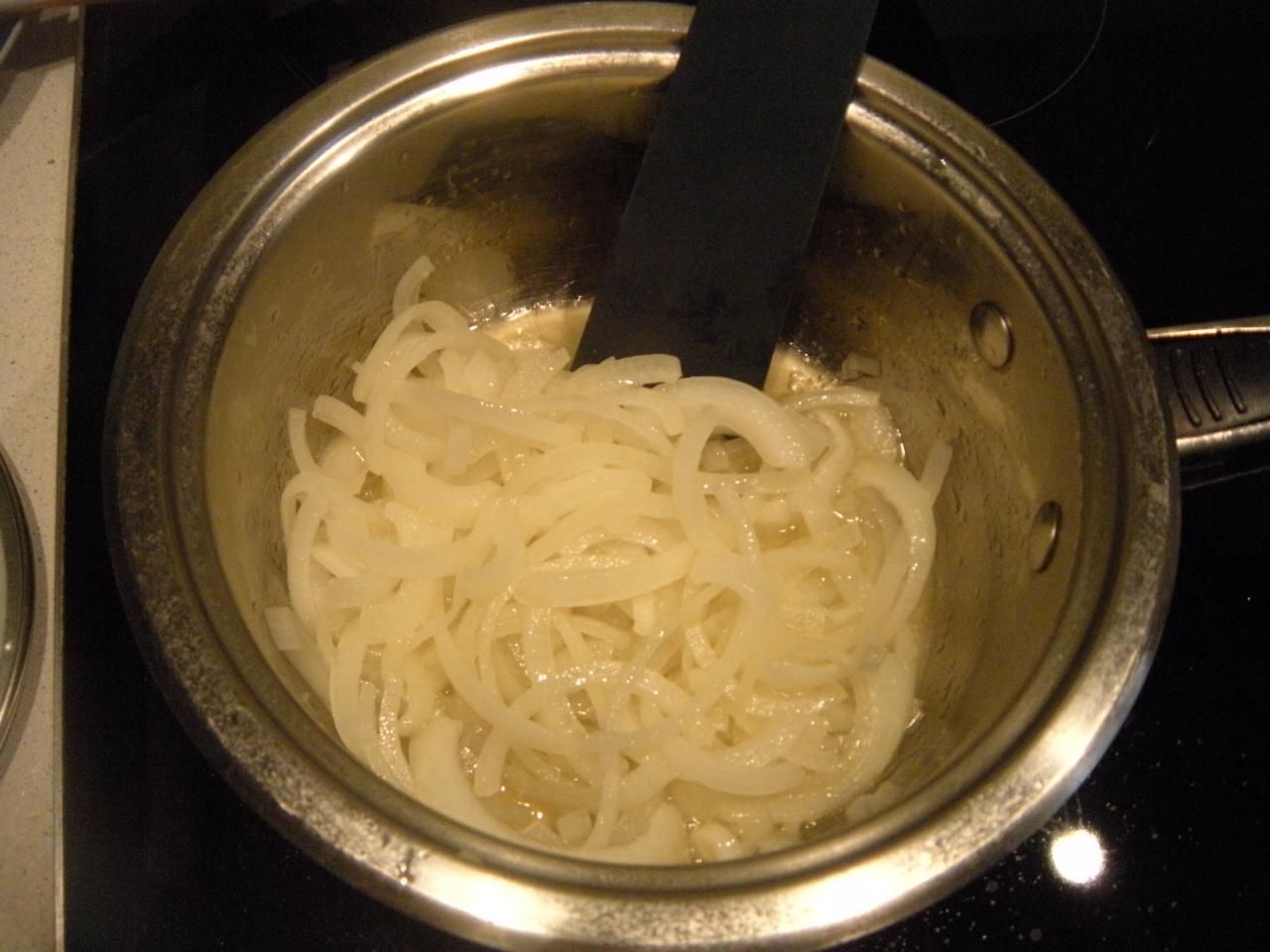 Нарезаем лук соломкой, обжариваем в масле до золотистого цвета в чугунке.