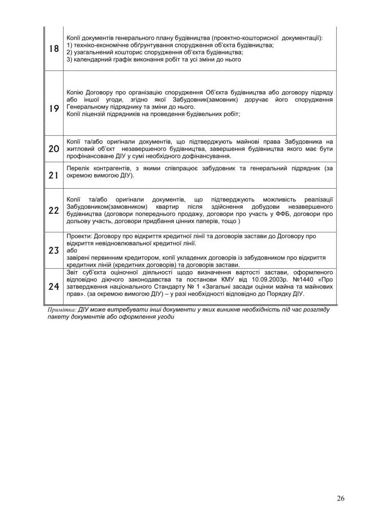 Государственное ипотечное агенство (укр. ДІУ), может рассматривать вариант предоставления кредита банку (в данном случае - Марфин), который потом "перепродает" этот кредит компании-застройщику для достройки объекта незавершенного строительства при условии обязательного получения следующего пакета документов (см ниже) от Застройщика.