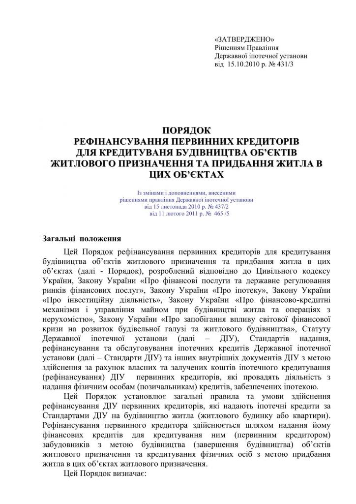 Государственное ипотечное агенство (укр. ДІУ), может рассматривать вариант предоставления кредита банку (в данном случае - Марфин), который потом "перепродает" этот кредит компании-застройщику для достройки объекта незавершенного строительства при условии обязательного получения следующего пакета документов (см ниже) от Застройщика.