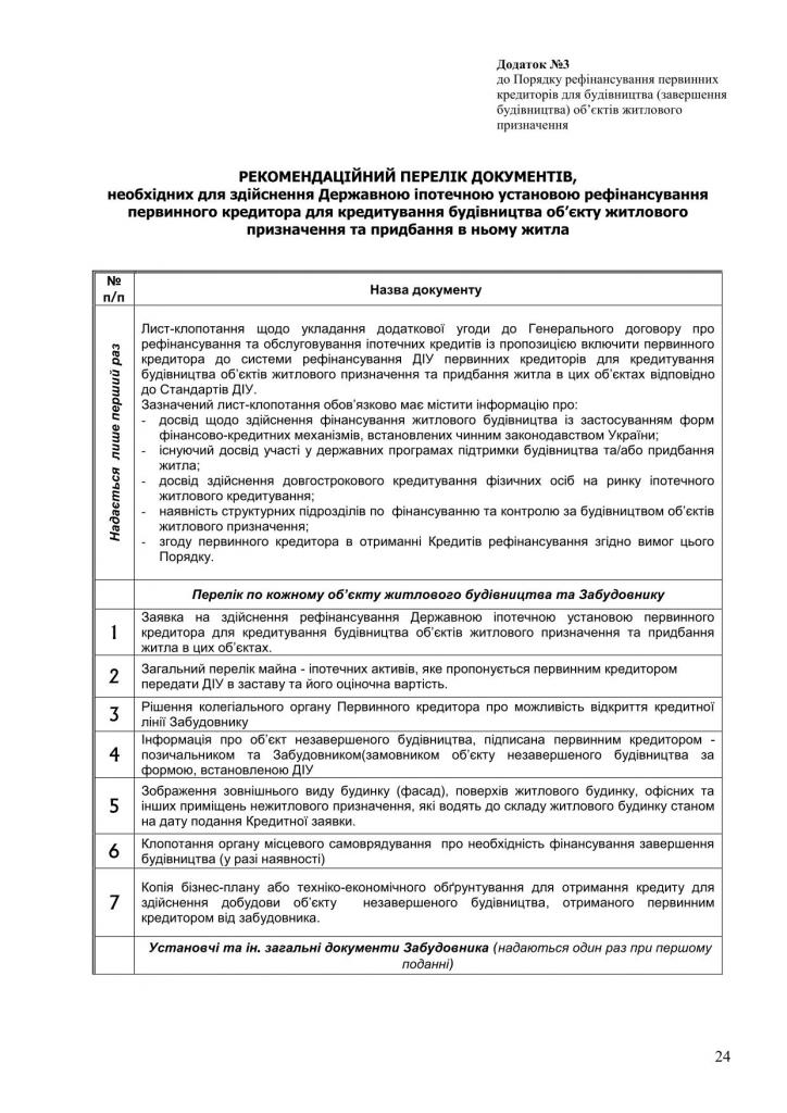 Государственное ипотечное агенство (укр. ДІУ), может рассматривать вариант предоставления кредита банку (в данном случае - Марфин), который потом "перепродает" этот кредит компании-застройщику для достройки объекта незавершенного строительства при условии обязательного получения следующего пакета документов (см ниже) от Застройщика.