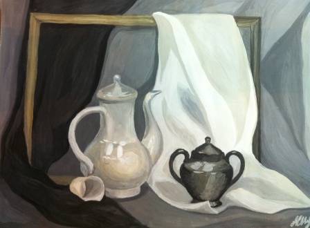 enota, техника выполнения у вас очень хорошая, акварель прозрачная и живая вышла! Но предметы в натюрморте находятся не в изолированной среде, каждый объект подвергается влиянию окружения. Это проявляется в первую очередь в рефлексах на предметах. Вы попытались передать их на кувшине (зеленый рефлекс от яблока) и тыкве (хорошо видно рефлекс от синей драпировки), на тыкве получилось правдоподобнее, что ли)) Но как же яблоко? оно должно иметь достаточно активный рефлекс от красной драпировки. И ещё маленький совет: не бойтесь смешивать цвета в границах одного объекта, играйтесь не только с тональностью цвета, но и с теплохолодностью!
