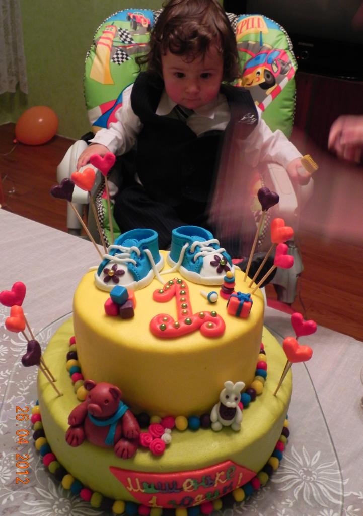 Ого,тортик!А в какой форме вы его пекли,что он такой большущий?Очень красивый,тем более как для первого раза,просто супер!Ребенок,правда,еще мало понимает,потом на фотках сможет оценить ваши старания,как подрастет))Но вашу любовь,с которой делали тортик,уверена,чувствует и сейчас хорошо!