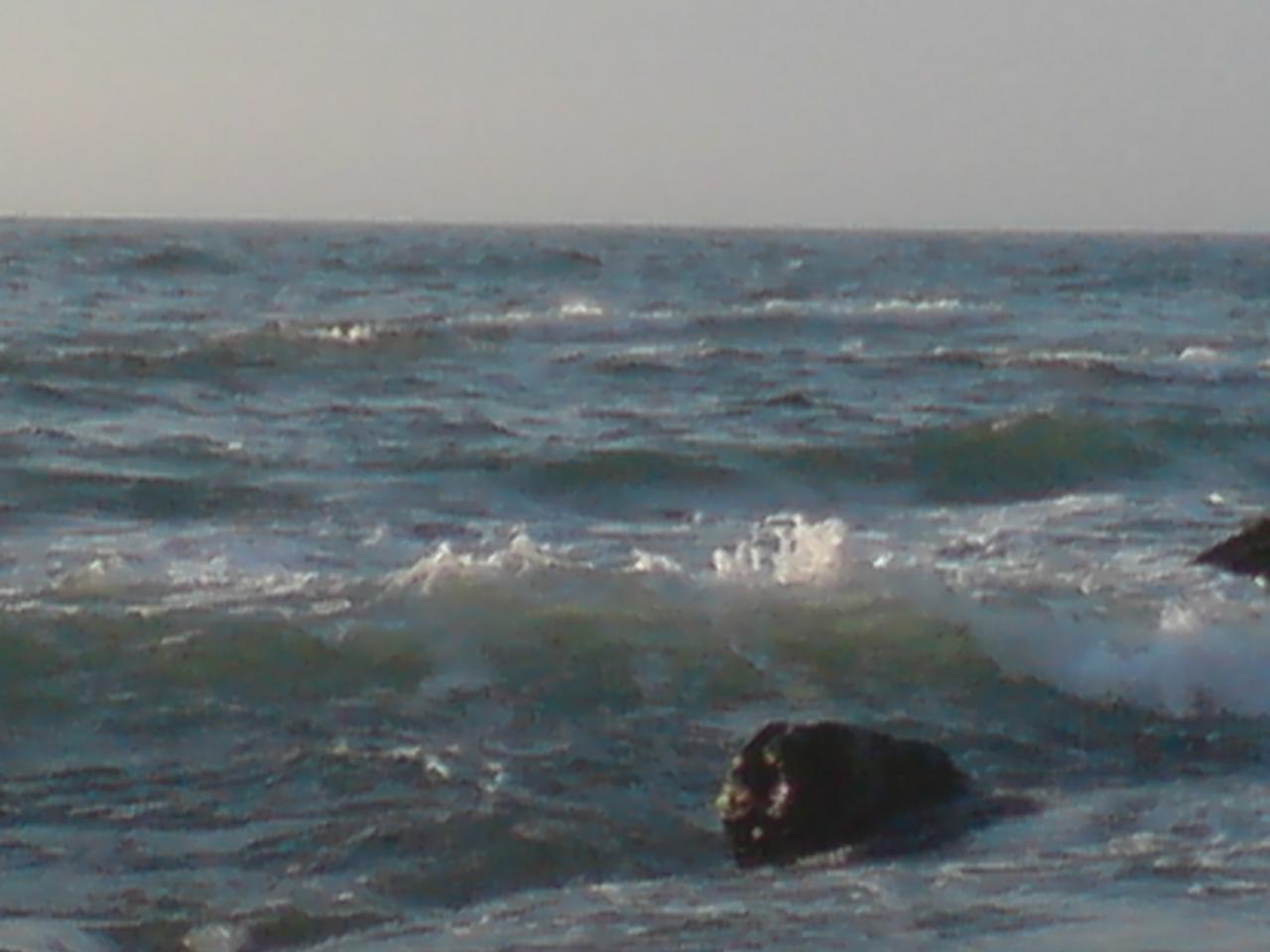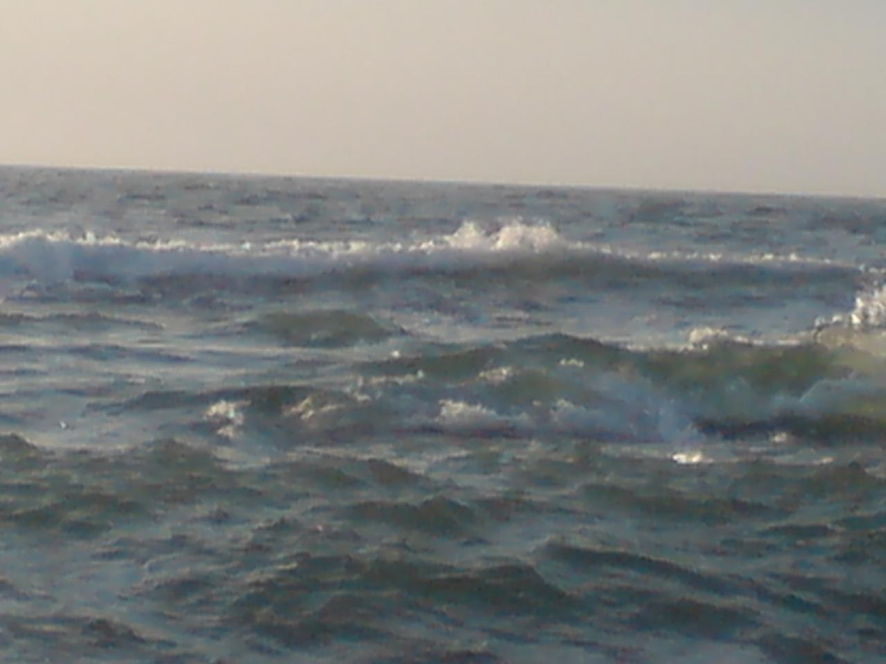 Волны, вода полупрозрачная. Небо чистое, ветер примерно юго-восточный.