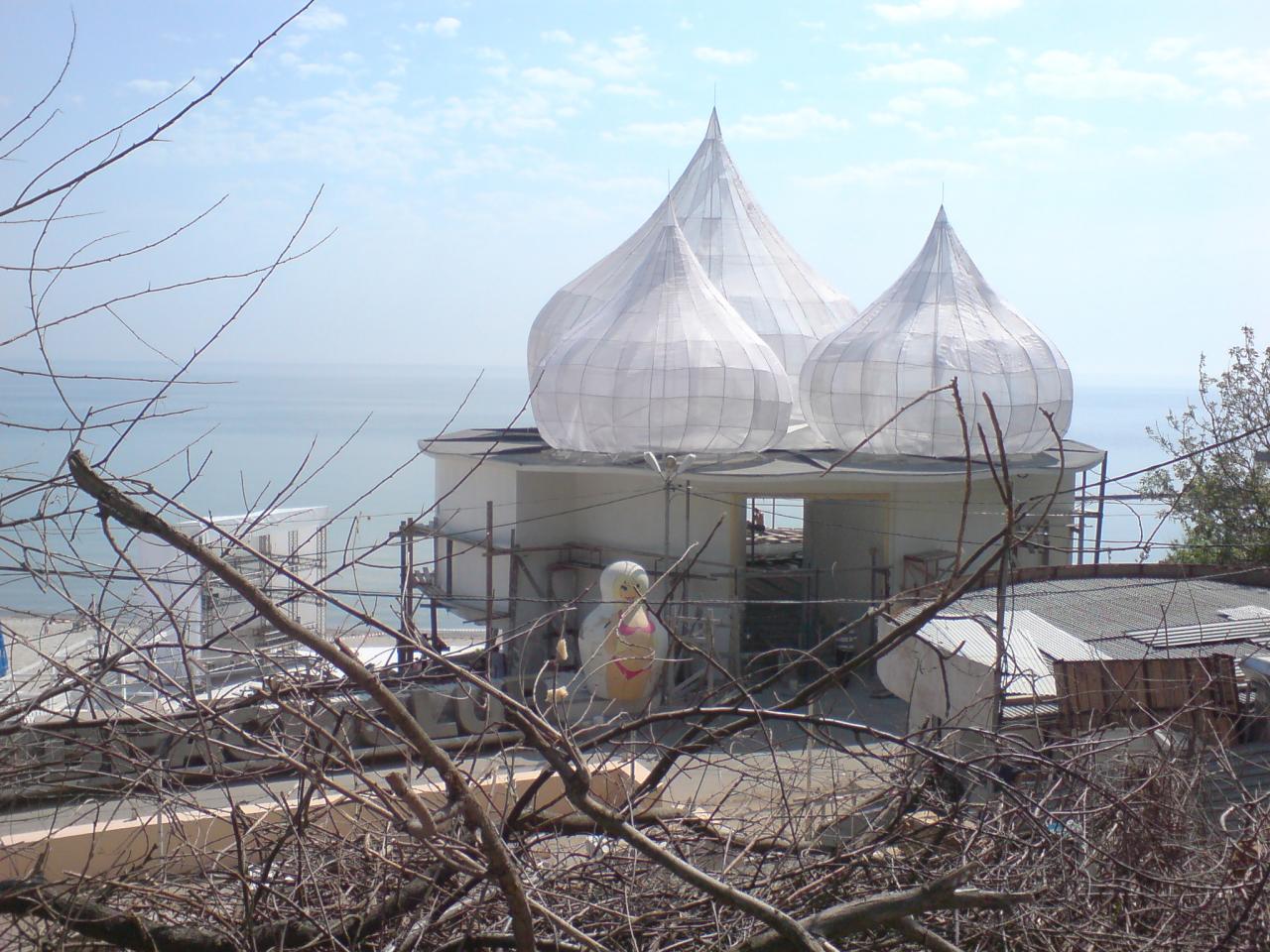 Ротонды больше нет!Нет в ее первозданном виде.Они делают ремонт,и отгородились от посторонних глаз.На песке деревянный настил и выставлена сцена.Постройка перед Ротондой снесена.