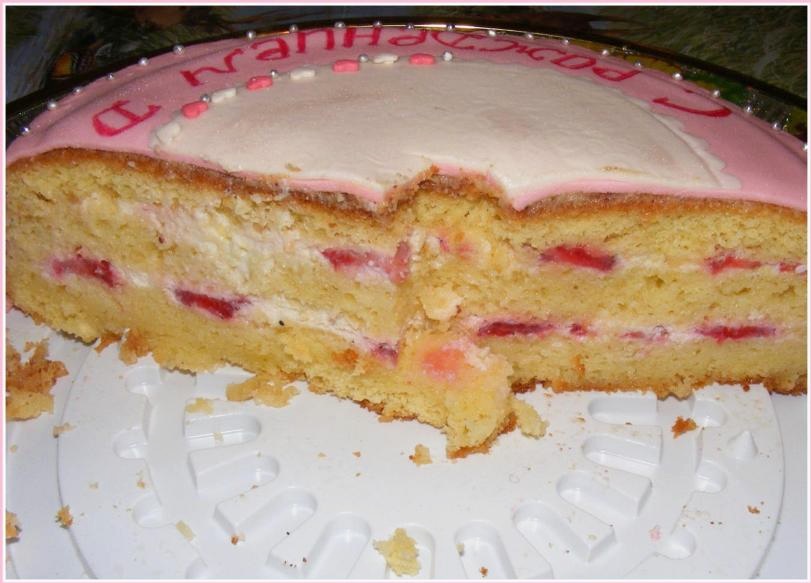 Тортик-нежный бисвит с творожным кремом и свежей клубникой.
