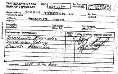 Учётка банковская. У меня такие тоже где то валяются с "лихих 90-х". Ни а чём. Сколько денег в банке на счёте "Сомоли интерпрайсез" покажешь? Про транзитные офшорные счета не слыхивал? Ну да ладно. Я думаю, что аналогичную бумагу в своё время и я официально предоставлял в налоговое управление и НБУ для определённых операций, правда. И что? Это говорит о том, что я -мульонер? Отнюдь.