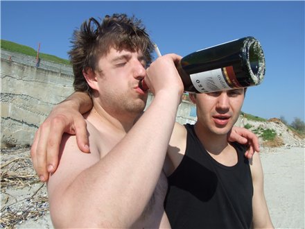 пьяный в жопу жирдяй на пляже хлещет вино из горла, зажав в той же руке окурок.