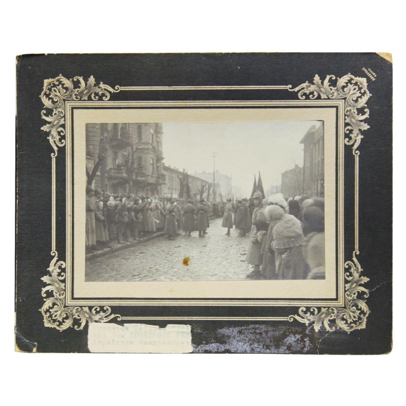 СССР, студия фотографа Покорного, Одесса, начало 1920-х гг. Отличное состояние. Размер фото с подложкой 19*23 см, размер самого снимка 11*15 см. Оборотная сторона чистая. На лицевой стороне приклеена часть бумажной бирки, на которой можно прочесть: «Принятия шефства ТАБА… над 7-м ПОЧЕТНОГО РЕВ (ОЛЮЦИОННОГО)… лерийским Воздухоплав (ательным)…». Оригинал.