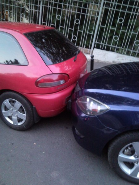 Вчера вечером небольшие догонялки на Азарова на спуске к ТЗ, кто-то плохо зятянул ручник на мазде, которая со временем скатилась и уперлась в мицик. Будьте внимательнее оставляя свои автомобили на спусках.