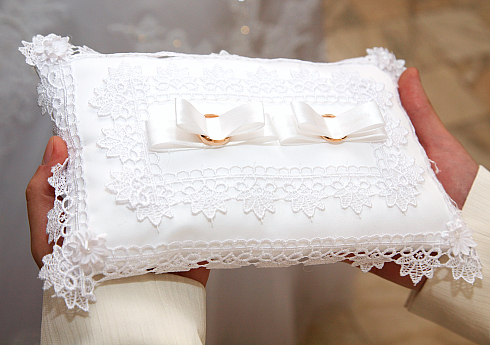 Красивая лаковая деревянная коробочка для ювелирных изделий с бархатной обивкой внутри, которую вполне может передать свидетель со стороны жениха - как-то краше, да и красоту колец она скорее подчеркнет, чем подушка с нейлоново-непонятными бантиками, кружевами и стразиками) Если уж играть в европейскую вариацию церемонии то может до конца? Там практически всегда кольца у шафера)