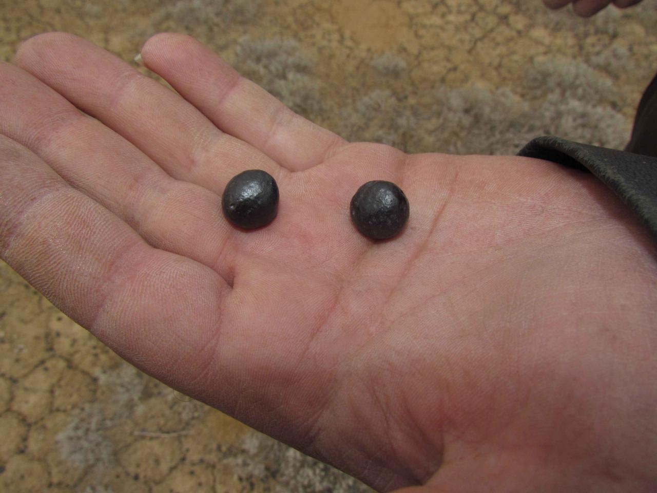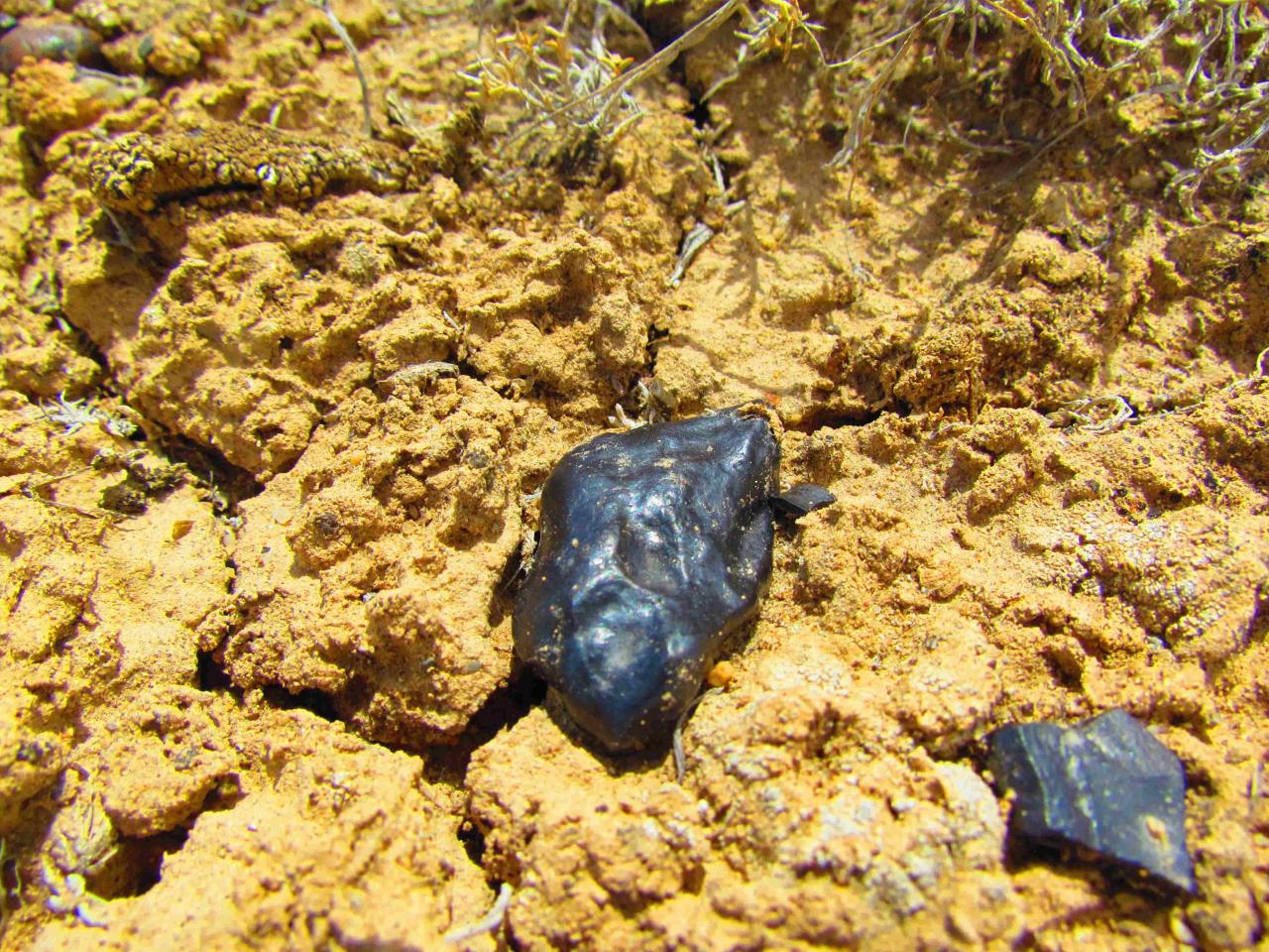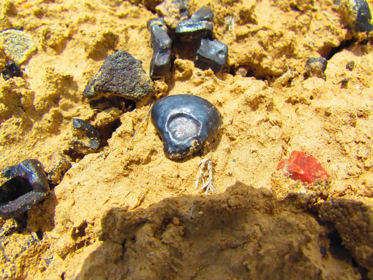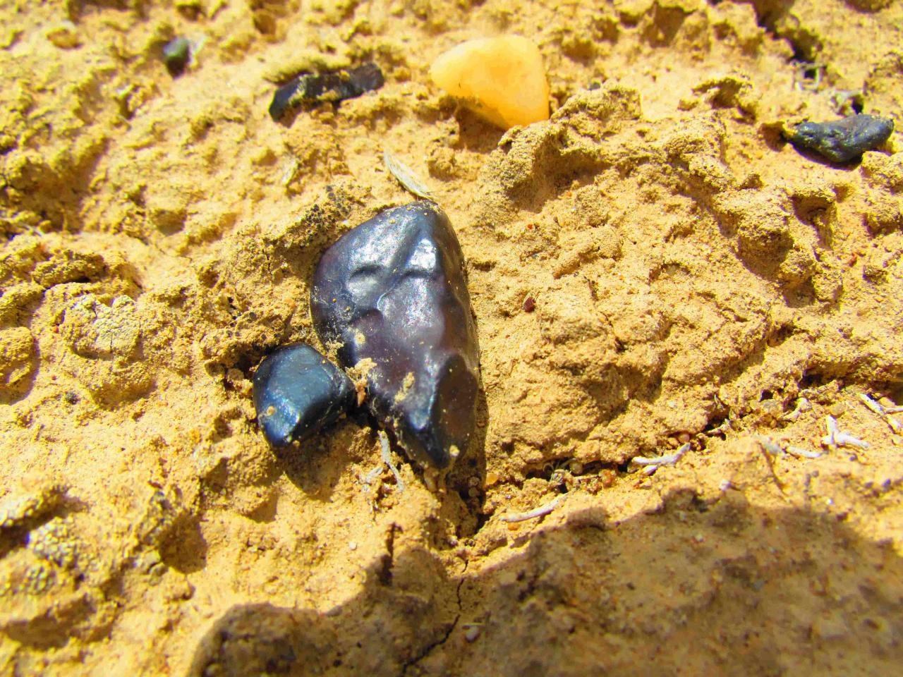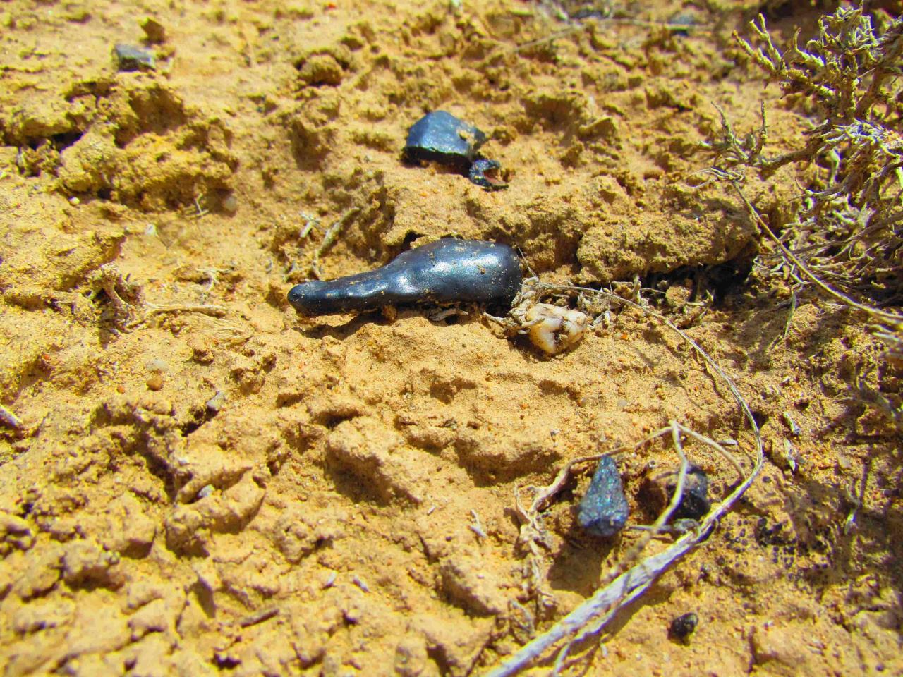 Так как по рельефу местности можно примерно вычислить направление взрывной волны, после долгих и сложных компьютерных расчётов нами были найдены локализованные участки небольшой площади, где мы обнаружили необычные "камушки". Они имеют вид застывших расплавленных капель как бы из очень темного и грязного стекла. Найти их можно после того, как был сильный ветер, а потом прошёл дождь. После этого они и появляются из почвы: