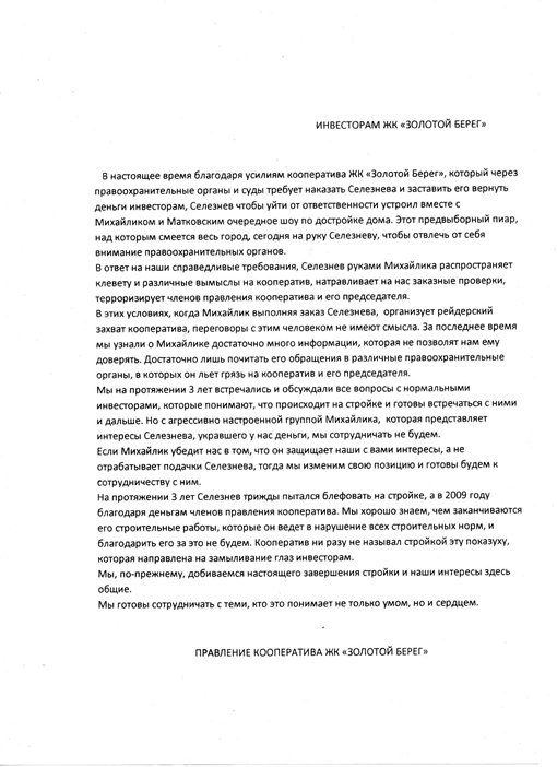 - А.Селезнев принял ошибочное решение отчуждить в пользу набирающей силу общественной группировки (кооператива, могущего собирать дополнительные взносы и, гипотетически, получить кредиты) долю в уставном фонде с целью переложить на В.Балаяна ответственность на стройку, в т.ч. на нецелевое использование (разворовывание) денежных средств в 2007 г., а также ответственность за возможный "госкредит Тимошенко", о котором настоятельно говорили в руководстве Минрегионбуда, начиная с 2009 г.;