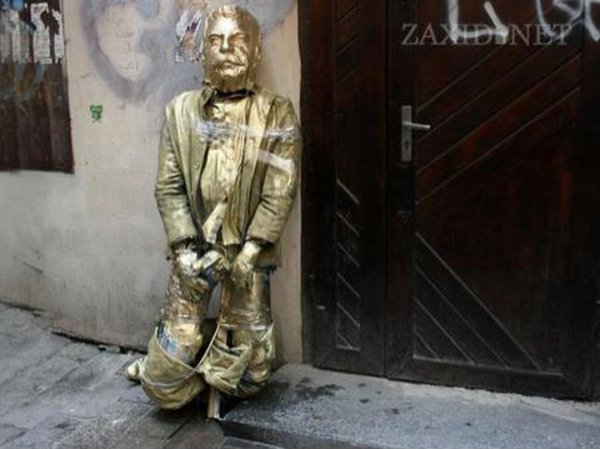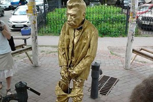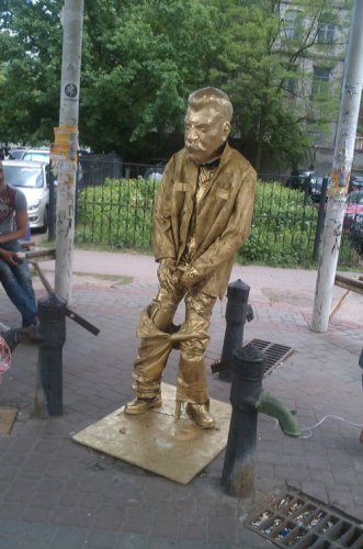 В Киеве установили сделанный из фольги памятник Сталину, который якобы собирается справить малую нужду.