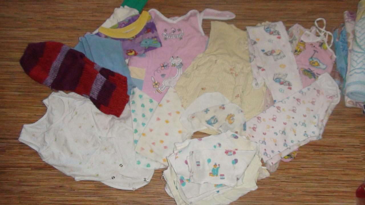 есть 2 кулька вещей : 1 - вещи для новорожденного (распашонки, ползуны, несколько пеленок), пару игрушек, 3 маленькие наволочки, 13 памперсов №1. обувь на годик. состояние вещей разное, есть с пятнышками, все для дома-дачи.
