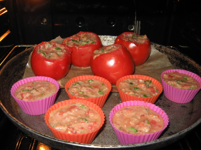 Помидорчики тоже надо подсолить в серединке и затем нафаршировать. Остальной фарш можно в силиконовые формочки (тоже очень вкусно)