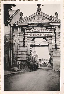 Приветственный лозунг ОУН(б) июль — начало сентября 1941 года на Глинских воротах замка в г.Жовква Львовской обл. Текст (сверху вниз) — «Слава Гитлеру! Слава Бандере! Да здравствует независимая Украинская соборная Держава! Да здравствует Вождь Ст. Бандера! Слава Гитлеру! Слава непобедимым немецким и украинским вооружённым силам! Слава Бандере!»![]()