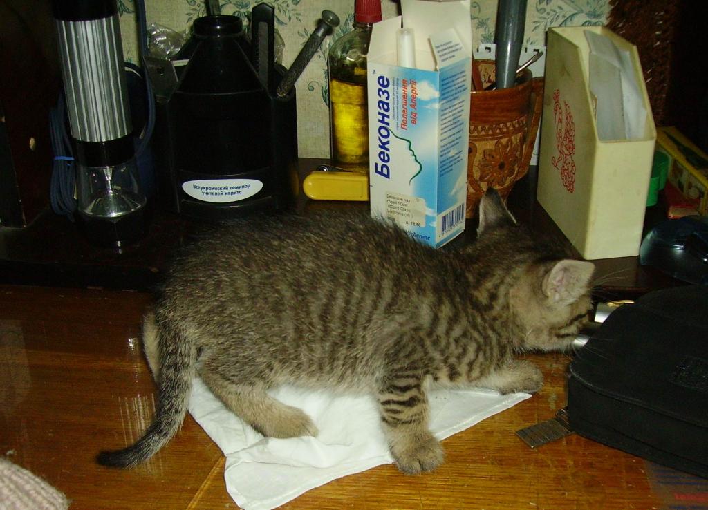 В клинике я еще не был. На улице такой дождь. Котенок чувствует себя вроде нормально. Один раз пописал в лоток (перед этим забивался в углы комнаты и пищал, пока я его не поставил на лоток).