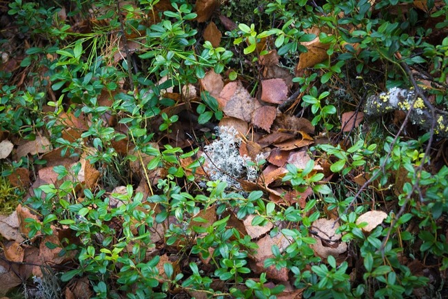 В лесу ягель, брусника и осенние листья.
