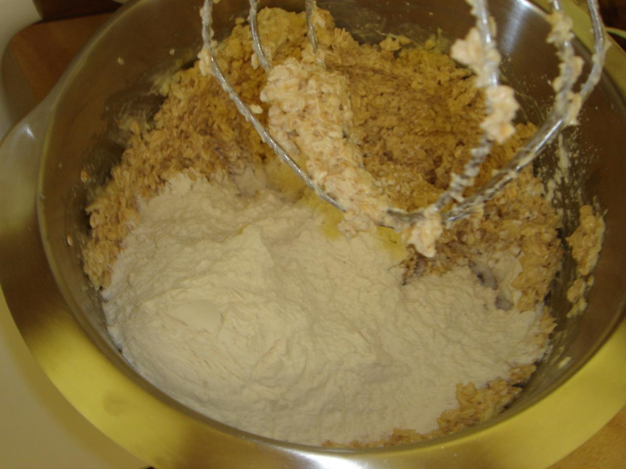 Снимаем с огня, добавляем муку, тщательно перемешиваем. Добавляем в тесто измельченные грецкие орехи и еще раз перемешиваем. Тесто должно быть густым.