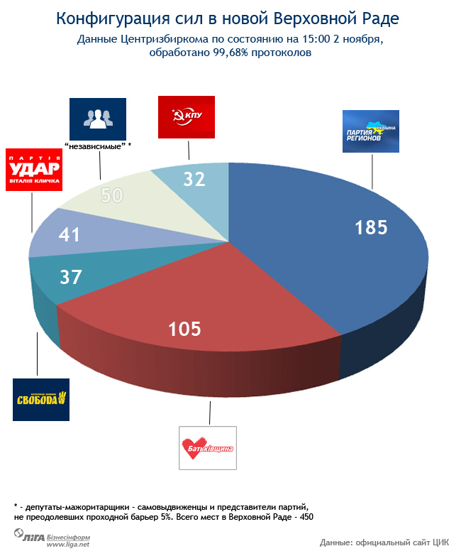 Согласно данным, представленным пресс-службой ЦИК, Партия регионов набирает 29,99%; ВО «Батькивщина» – 25,53%; «УДАР» – 13,95%; Компартия Украины – 13,18%; ВО «Свобода» – 10,44%.