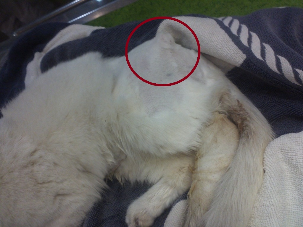 Фото делали вчера перед клиникой,красным очерчено место,где косточка вылезла прямо наружу. Просто Счастливчик весь белый и не очень хорошо видно и 2 лапы забинтованы бинтами.