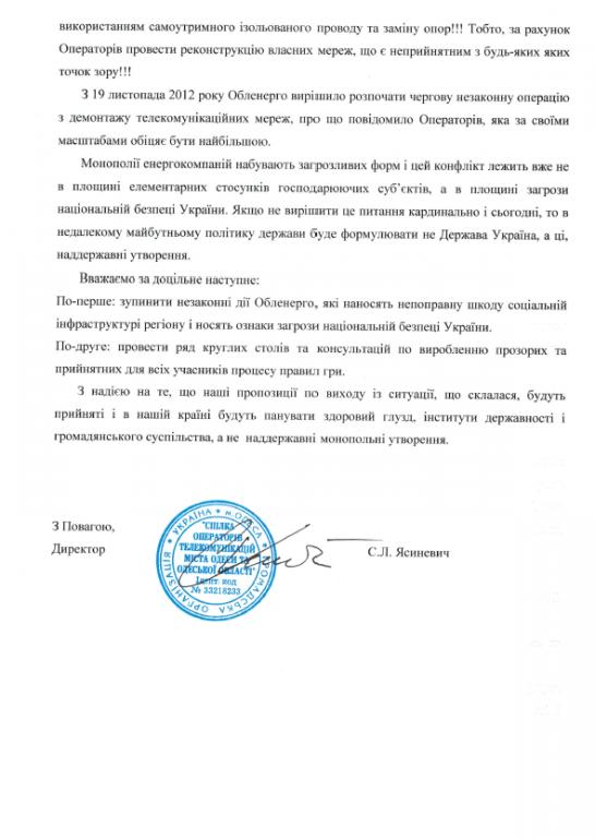 Текст открытого письма от "Союза операторов телекоммуникаций г, Одессы и одесской области".