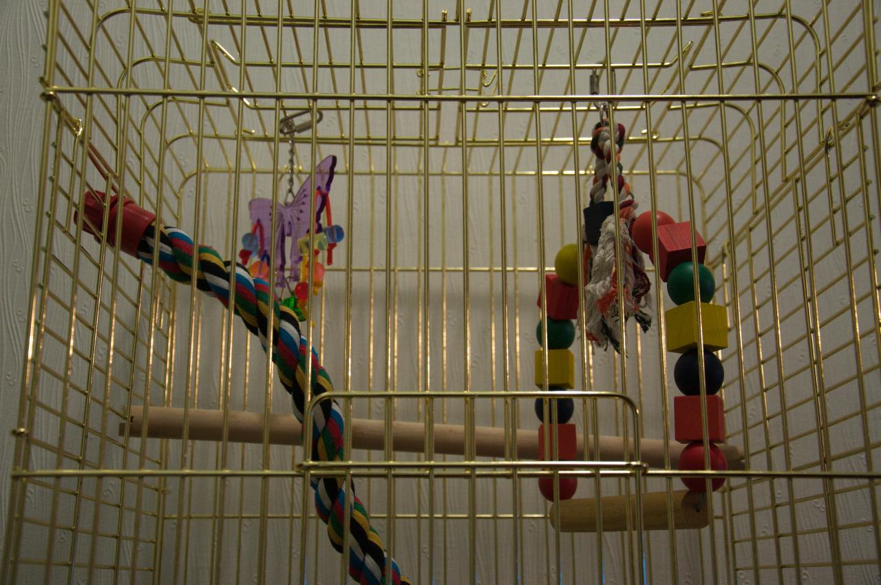 Julianna_R - у нас такая же клетка. Жакоши очень настороженно воспринимают всё новое, они консерваторы по натуре. Он попадает в новую обстановку, у многих срабатывает оборонительная реакция (страшно и вокруг одни враги). А такие яркие и непонятные предметы - вообще "страшилки из фильма ужасов". Почитайте тему - даже взрослым птицам новые игрухи вначале кладут вне клеток и подальше, но в поле их зрения. Затем перекладывают ближе и лишь потом предлагают поиграть.
