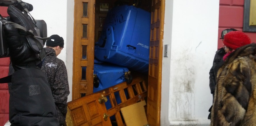 В знак протеста граждане взломали входную дверь, намереваясь войти силой.