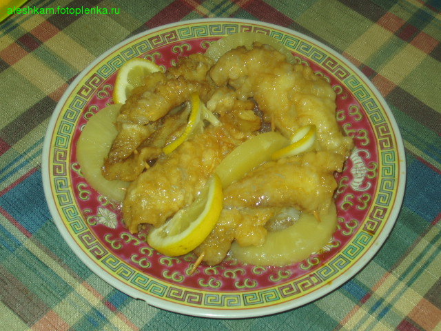 Одна половинка готовится по аналогии кисло сладкой свинины,различие лишь в том что из добавочных компонентов используется только банан и лук