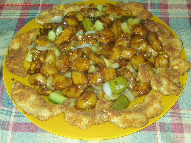 Смешайте соль, рисовое вино и яйцо. Обмакните в эту смесь кубики мяса, а затем обваляйте их в крахмале. Нагрейте в сковороде «вок» масло до появления дымка и жарьте свинину в течение 5 минут до хрустящей корочки. Шумовкой выньте свинину и подсушите на бумаге.