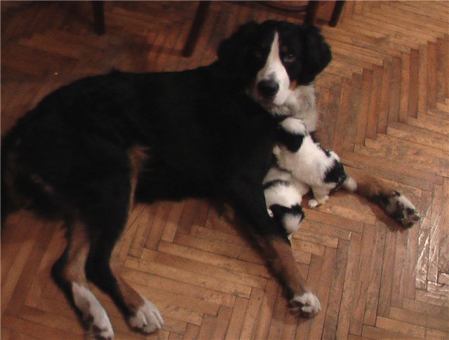 Бернский зенненхунд...собака которая может быть нянькой не только для детей но и для щенков другой породы...у меня в доме живет бернц...японский хин...и русский гладкошерст.той-терьервот...