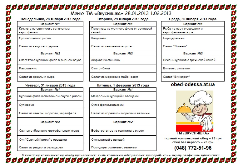 Кто заинтересовался, пишите в личку свой e-mail, я Вам скину менюшку на неделю.